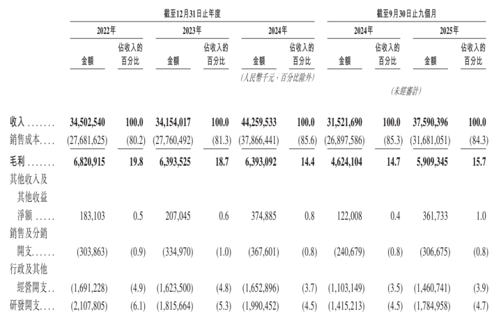 领益智造作为苹果、华为等巨头供应核心零部件的企业,公司在过去三年呈现出典型的“增收不增利”特征。根据招股书披露的财务数据,2022年至2024年,公司营业收入从345.0亿元增长至442.6亿元,年复合增长率达13.3%,但同期毛利率却从19.8%持续下跌至14.4%,2025年前三季度虽略有回升至15.7%。